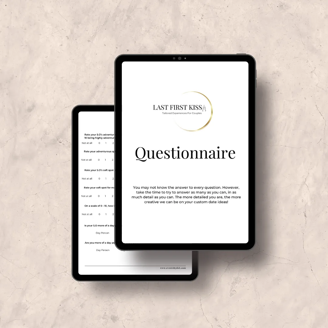 Our customer service team is available to answer any questions or provide guidance throughout your journey. If you would like to upgrade to the Premium "Plan It For You" package where we provide your date ideas for you, you can simply email us back your filled out questionnaire to hello@eventsbydab.com. Please include - "Last First Kiss Completed Questionairre" in the subject line.